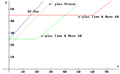 Für die Hauptzeit gilt. Wenn man weniger als ca 4 Minuten (Schnittpunktberechnung ergibt S(4,24/25)) telefoniert, ist e- plus Privat am günstigsten. Telefoniert man durchschnittlich zwischen 4 und 40 Minuten, dann ist der Tarif Time & More 20 günstig. Wenn man mehr als 40 Minuten telefoniert, ist der Tarif Time & More 60 am günstigsten.